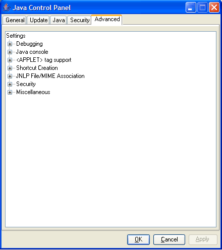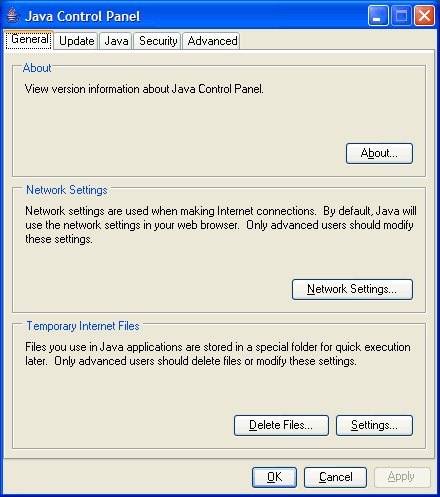 The Java Control Panel is a multipurpose control panel. It allows you to view and set a wide range of parameters controlling how Java runs on your computer. It lets you view and delete temporary files used for Java Plug-in, which allows Sun Java to be used by your web browser to run applets, and Java Web Start, which allows you to run Java applications over the network. It allows you to control certificates, making it safe to run applets and applications over the network. It allows you to set runtime parameters for applets run with Java Plug-in and applications run with Java Web Start. It provides a mechanism for updating your version of Java so that you always have the latest. And it allows you to set options for debugging, desktop integration, applet handling, etc. The Java Control Panel includes the following separately viewable panels: