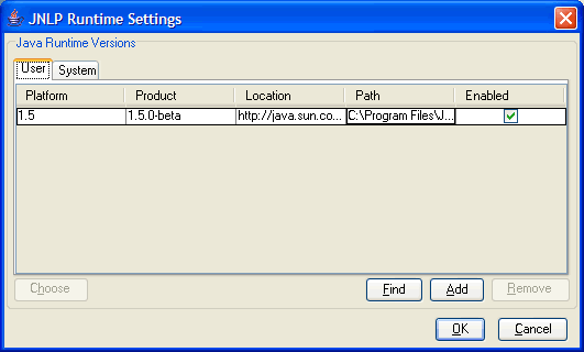 NotesThere will always be at least one entry. It will be the most recently installed JRE; i.e., the JRE associated with the Java Control Panel. Windows will show all JREs installed on a computer. The Java Control Panel finds the JREs by looking in the registry. On Unix the situation is different. There is no registry so there is no easy way to find the JREs that a user may have installed. Thus, for Unix there are Add and Remove buttons. For Unix, only version 5.0 or higher should be added. For Windows, where all JREs are found in the registry, only version 5.0 or higher will be displayed. However, a user can still run older versions. To do so, launch the Java Plug-in Control Panel for the older version, then (re)select the browser in the Browser tab. Example:Assume you are running on Microsoft Windows with Microsoft Internet Explorer, have first installed version 1.4.2, then version 5.0, and you want to run 1.4.2.